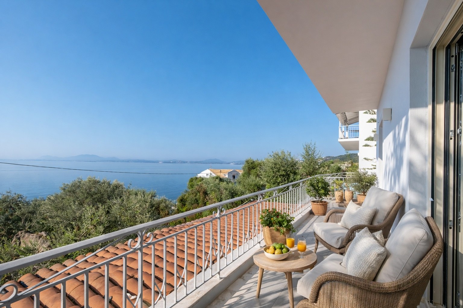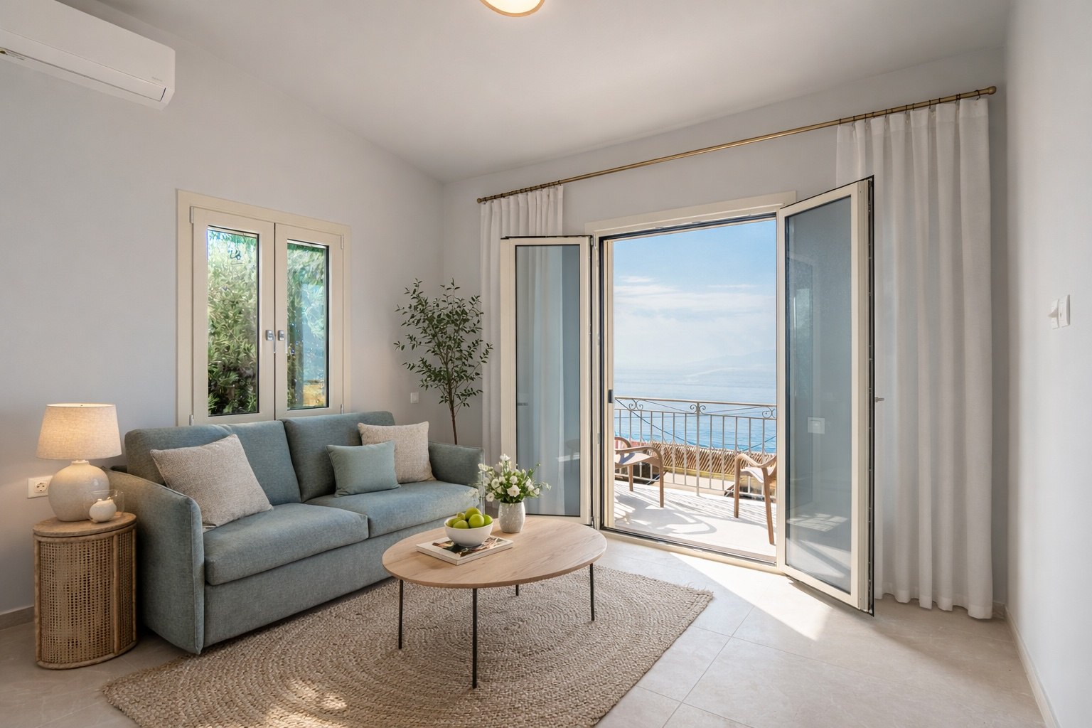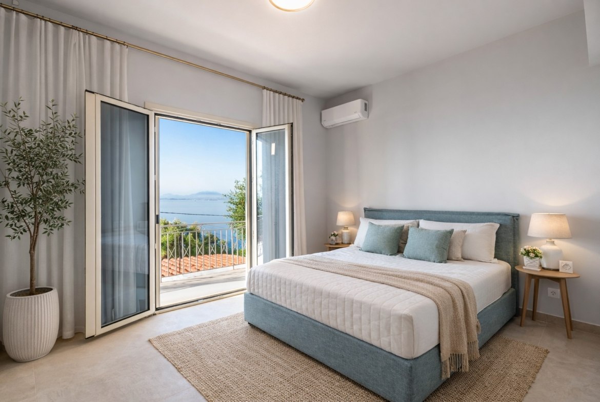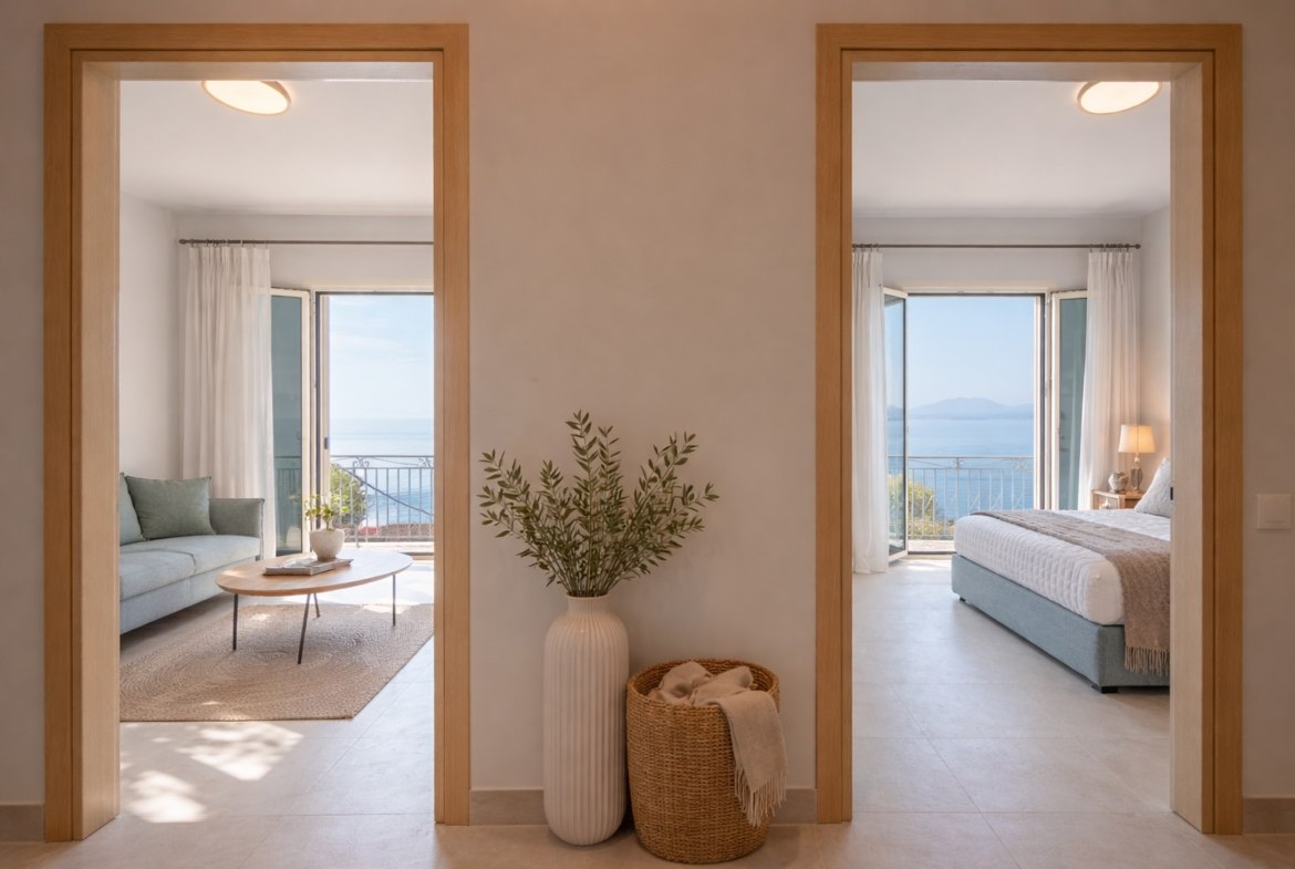 Das Gebäude umfasst drei vollständig möblierte Apartments, die jeweils komfortable Wohnbereiche und einen beeindruckenden Blick auf das Ionische Meer bieten.
