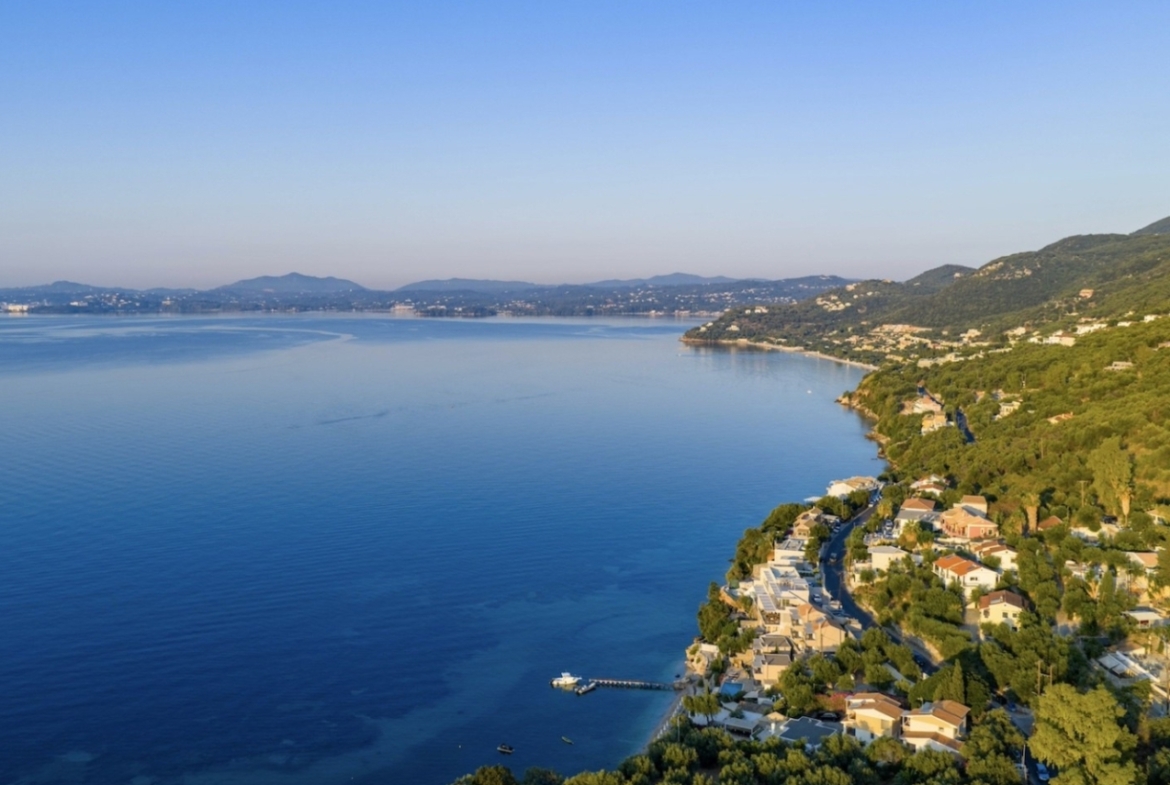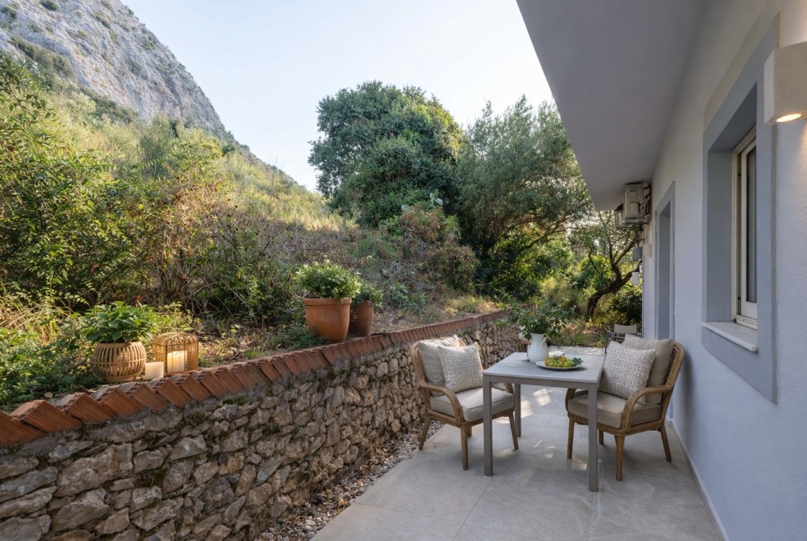 Die Anlage ist von einem gemeinschaftlich nutzbaren Garten umgeben, der sich ideal zum Entspannen oder für gesellige Stunden eignet. Zudem stehen den Bewohnern private Parkmöglichkeiten zur Verfügung. Sowohl von den vorderen als auch von den hinteren Terrassen eröffnet sich die Schönheit Korfus: zur Vorderseite ruhige Meerblicke, zur Rückseite üppige Berglandschaften.